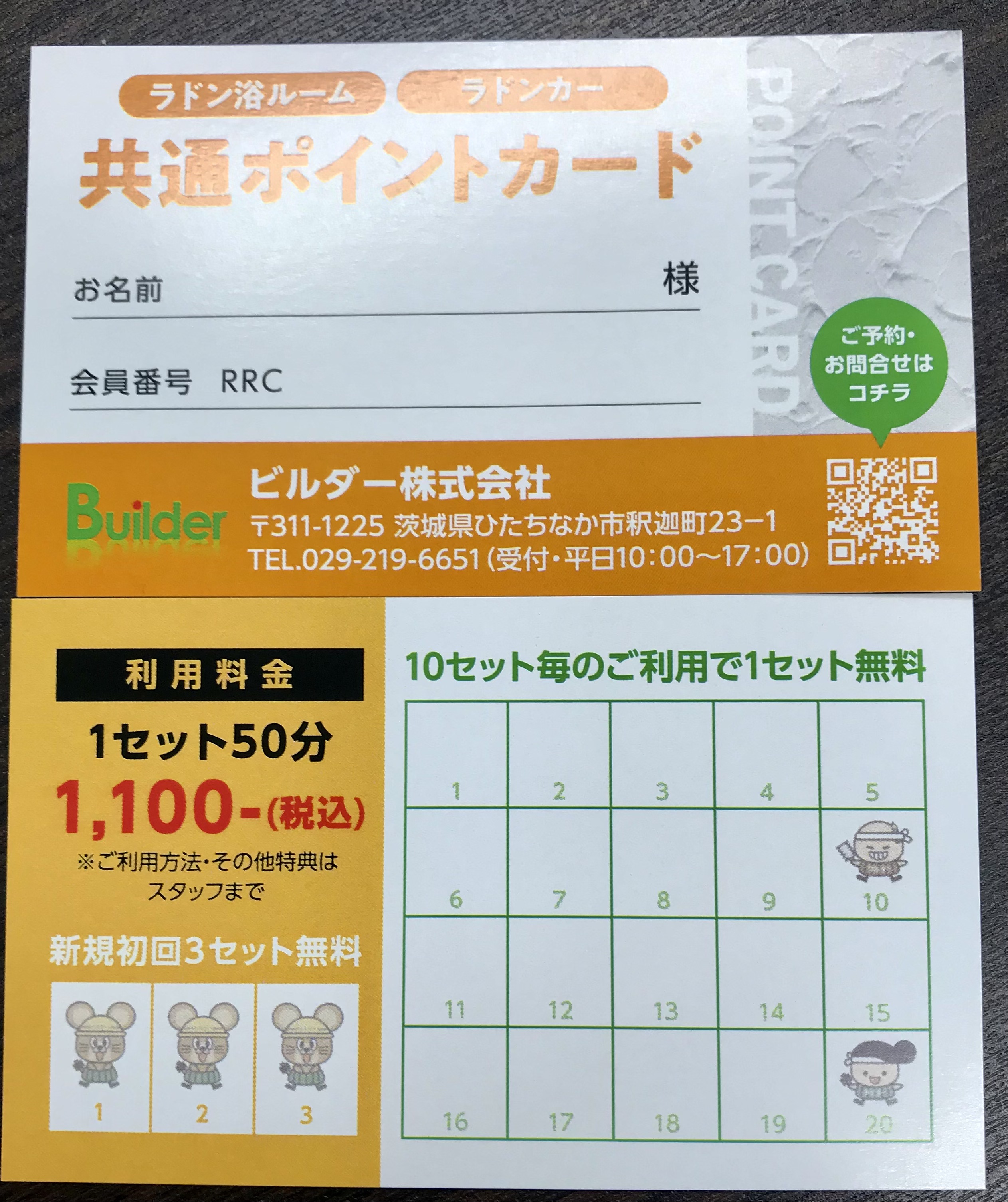 ラドンルーム及びラドンカー1セット(50分)ご利用毎に1ポイント、9セット利用すると次回は1セット無料になるポイントカードです。